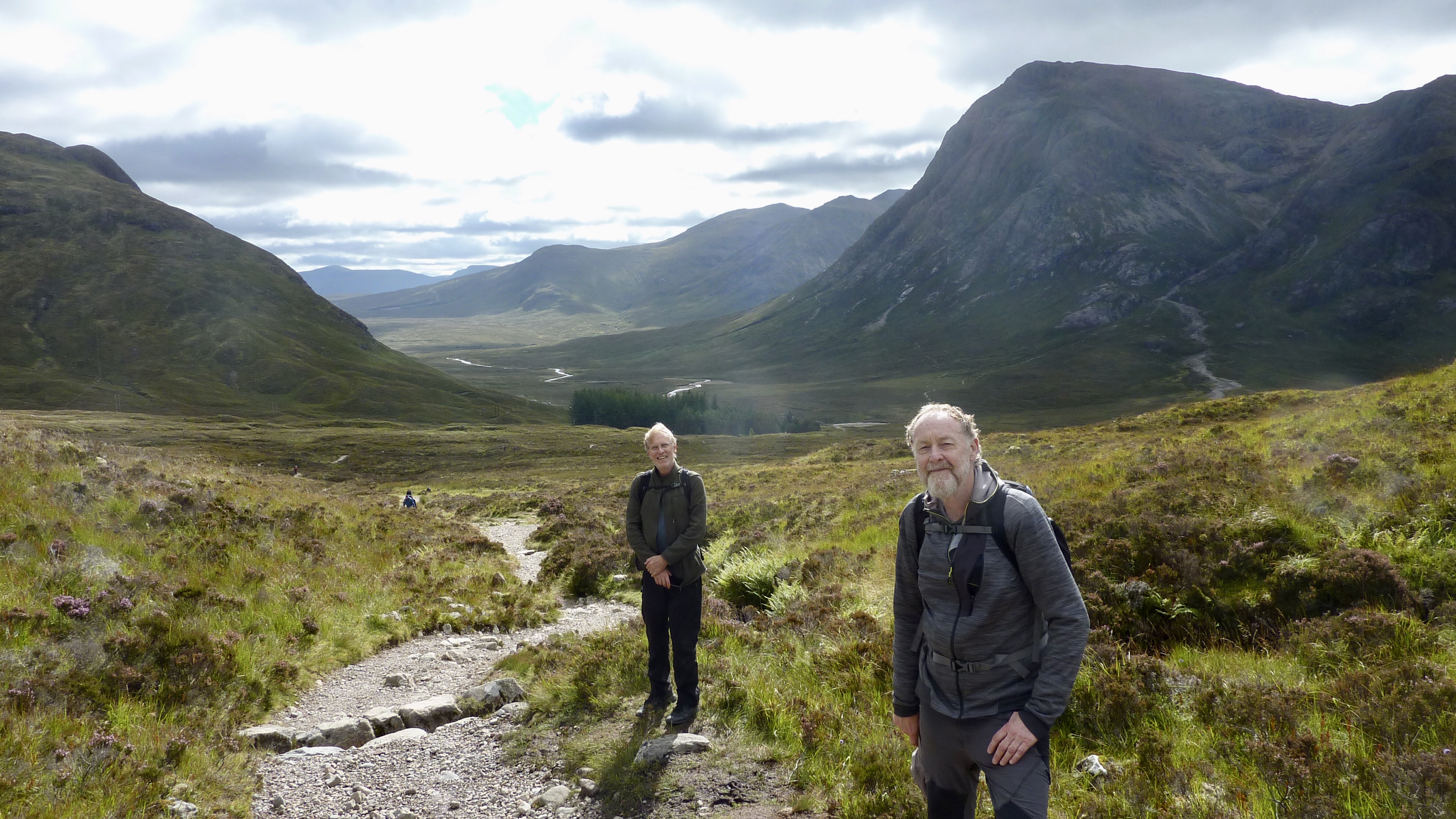 The waning gibbous moon was following the path of last night’s sun to hang as a silvery ornament above Glen Etive. After a few moments appreciation of the vast panoramic views I quietly let myself back into our hobbit hole but my dawn wanderings had woken both Chris and Jerome who immediately needed to head off to the toilet block (we’re all men of a certain age). We were grateful to be so close, the line of hobbit huts went on for forty or fifty yards and although there were showers and the drying cupboard at the other end of the site, all the toilets were down our end.